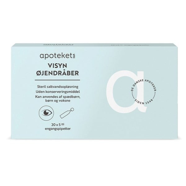 Apotekets Visyn Øjendråber er pipetter med steril, isotonisk saltvandsopløsning til at fugte og skylle øjnene ved irritation forårsaget af røg, støv, computerarbejde og lignende eller til udskylning af fremmedlegemer i øjnene.