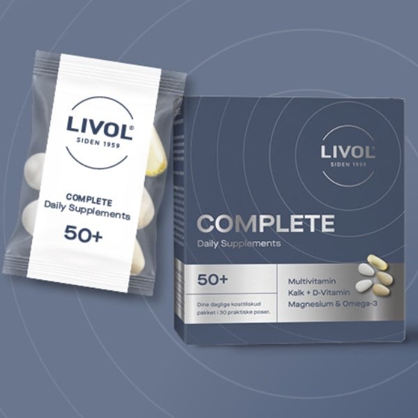 Nyhed LivolLivol complete 50+Dosispakker med Multivitamin, kalk + D-vitamin & Omega-3Læs mere 30 stk. 169,00 kr. Medlemspris 152,00 kr. Læg i kurv På lager - Levering 1-3 hverdage Fri fragt fra 249 kr. som klubmedlem. Bliv medlem TrustpilotTrustpilot