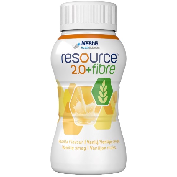 4 x 200 ml.Resource 2.0+ Fibre Vanille er en fuldgyldig ernæringsdrik med smag af vanille. Ernæringsdrikken har et højt indhold af energi og protein og indeholder 400 kcal og 18 gram protein pr. flaske.